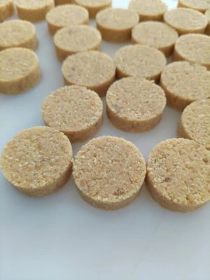 Pelotas de comida para cães, isco para peixes, doces de ervas para animais, comprimidos de ração e bolos de grama comprimidos.