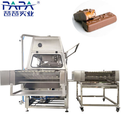 Esta máquina profissional de imersão em chocolate é projetada especificamente para a cobertura eficiente e uniforme de barras Snickers e outras barras de chocolate recheadas.